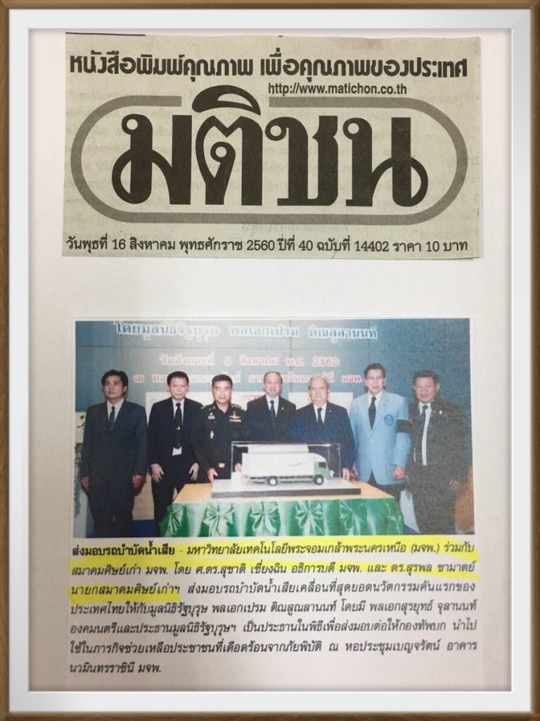 สื่อมวลชนต่างๆ เช่น หนังสือพิมพ์กรุงเทพธุรกิจ ฉบับวันอังคารที่ 15 สิงหาคม พ.ศ.2560 และหนังสือพิมพ์มติชน ฉบับที่ 14402 ปีที่ 40 วันพุธที่ 16 สิงหาคม พ.ศ. 2560 ลงข่าวพิธีส่งมอบรถบำบัดน้ำเสียเคลื่อนที่ สุดยอดนวัตกรรมคันแรกของไทยให้กับกองทัพบก โดยมี พลเอกสุรยุทธ์ จุลานนท์ องคมนตรีและประธานมูลนิธิรัฐบุรุษ พลเอกเปรม ติณสูณลานนท์ เป็นประธานในพิธี ซึ่งทางสมาคมศิษย์เก่ามหาวิทยาลัยเทคโนโลยีพระจอมเกล้าพระนครเหนือ ในพระบรมราชูปถัมภ์ ร่วมให้การสนับสนุนโครงการรถบำบัดน้ำเสียเคลื่อนที่ สุดยอดนวัตกรรมคันแรกของไทยนี้มาโดยตลอด เพื่อช่วยลดมลพิษทางน้ำ ฟื้นฟูธรรมชาติ และคืนน้ำดีให้กับแหล่งน้ำ